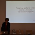 Dr. Csiszár Klára az egyházi gyakorlat alapjairól beszélt, különös tekintettel a zsinati folyamatokra. Előadásának alapjául a leprás meggyógyítását (vö Mt 8,1 – 4) vette. Hangsúlyozta, hogy az egyházmegyei zsinat kockázatokkal teli kegyelmi idő, egy csomó mellékhatással: megpezsdíti az életet, beszélgetések egyházi dolgokról, nyitás a világiak felé, elkezdődik a II. Vatikánum, az emberek leülnek beszélgetni, lelkesedés stb.